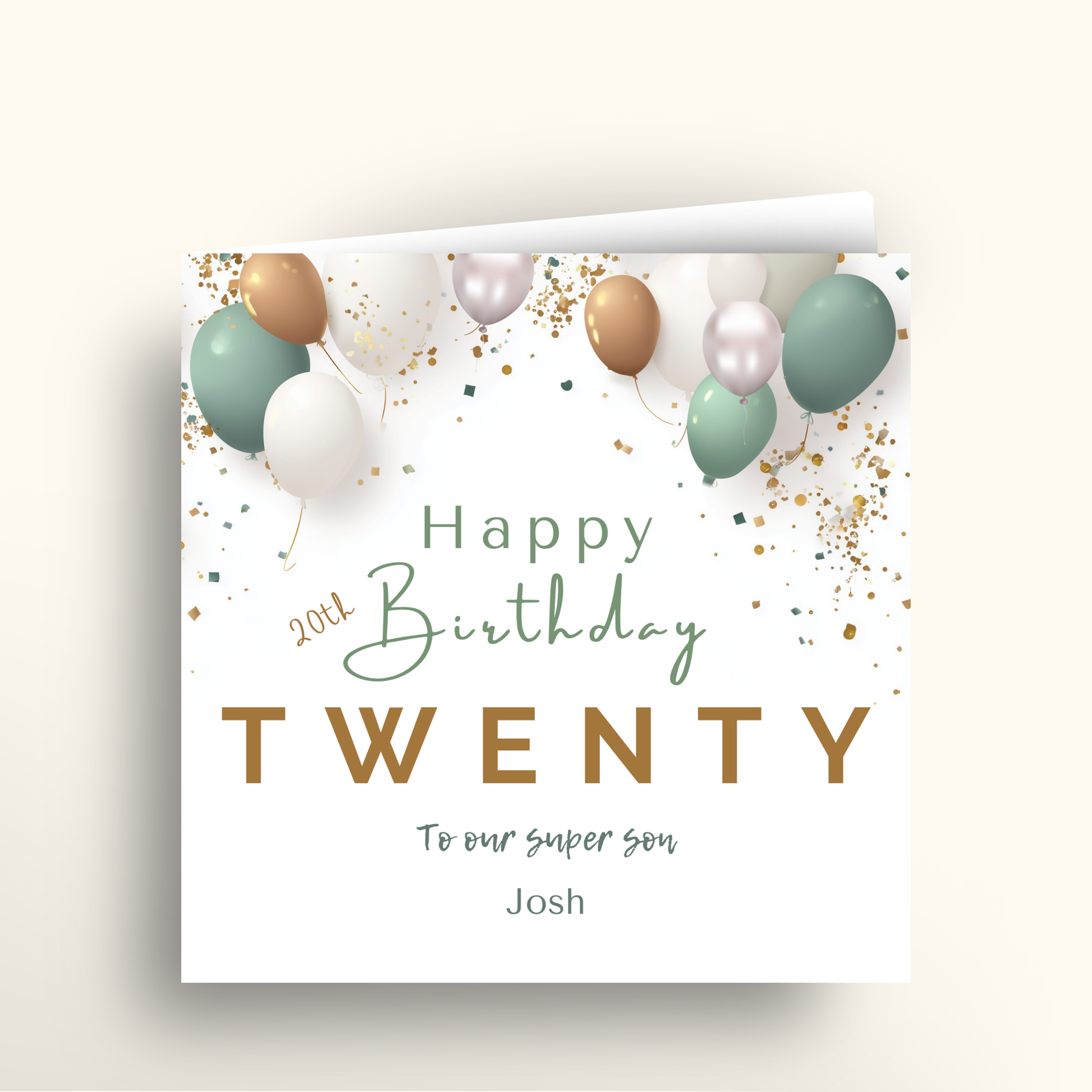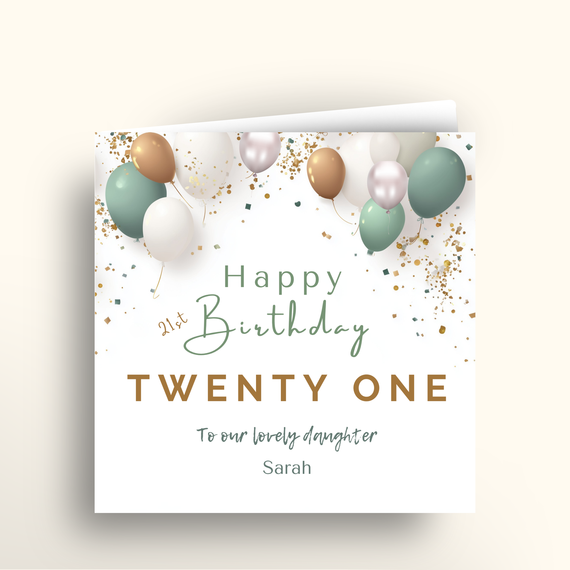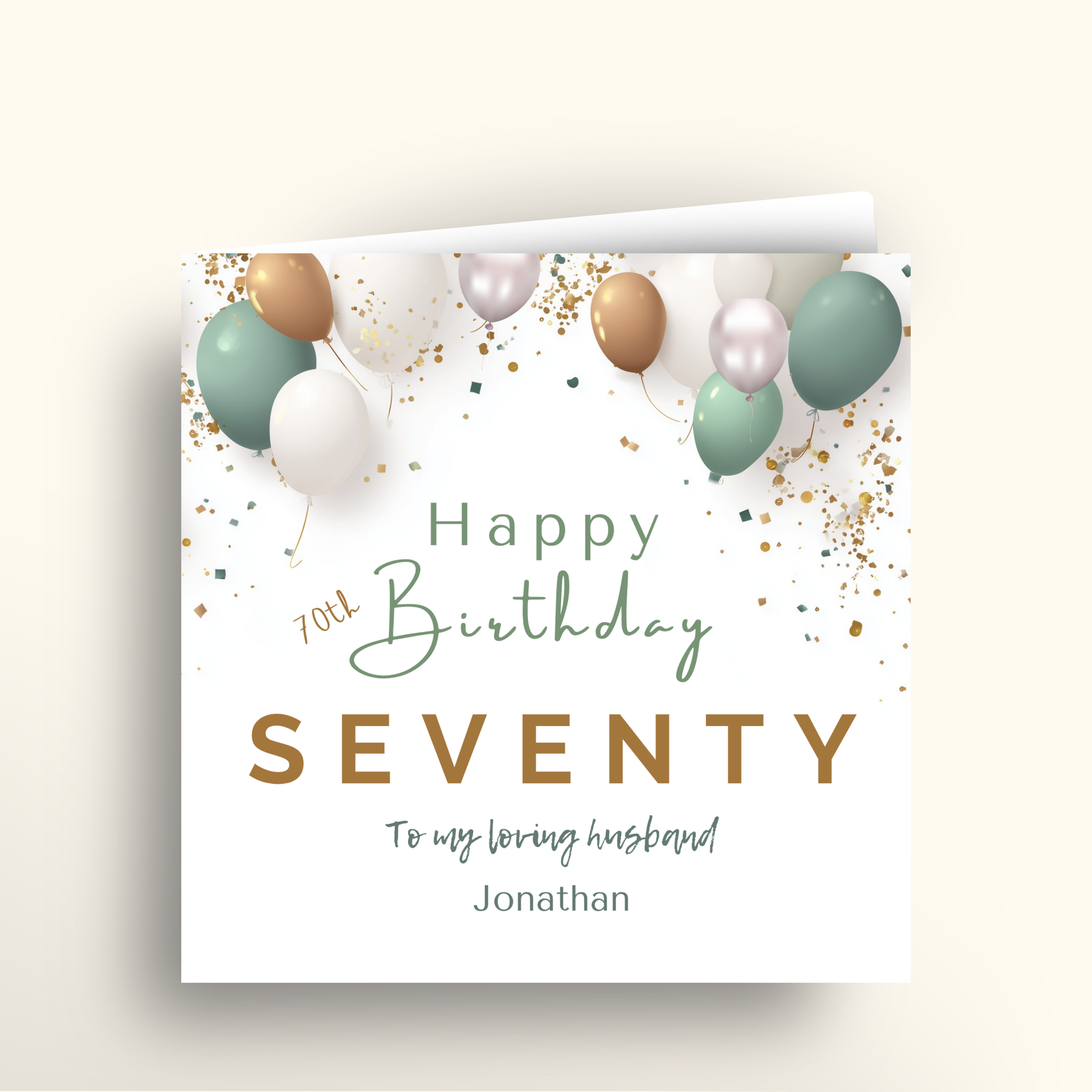 Celebrate a milestone birthday in style with this Elegant Birthday Card. Featuring soft sage, white, and gold tones with floating balloons and subtle confetti, this design perfectly balances modern minimalism with heartfelt warmth. Personalised with your name and age, it’s the perfect keepsake for marking a special year with sophistication and love.