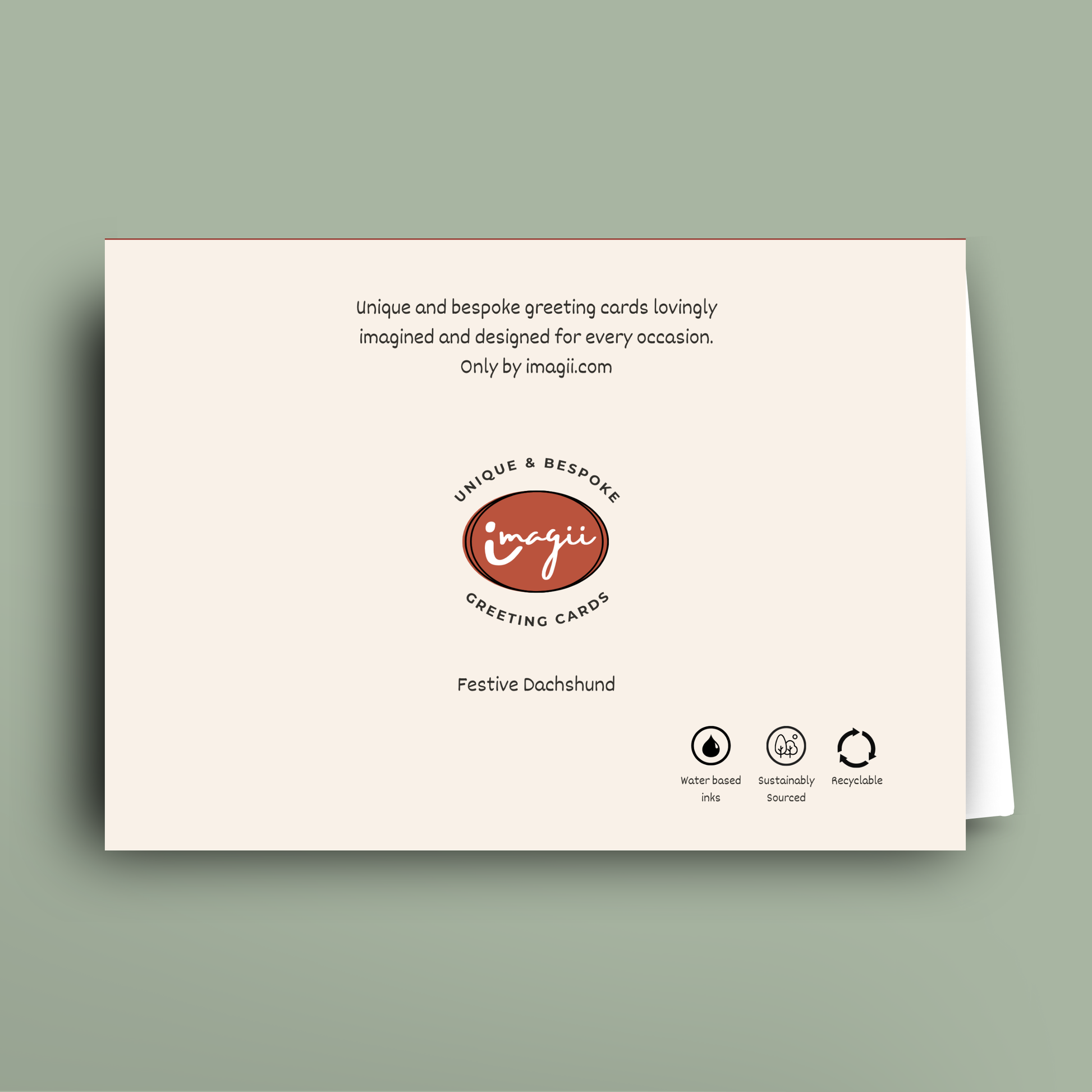 This charming Christmas card features an adorable dachshund wrapped in twinkling fairy lights, dressed warmly in a festive red jumper and Santa hat. Set against a rich red background, it perfectly captures the cosy spirit of the holidays with a touch of playful cheer. A delightful way to send joy to dog lovers and festive hearts alike.
