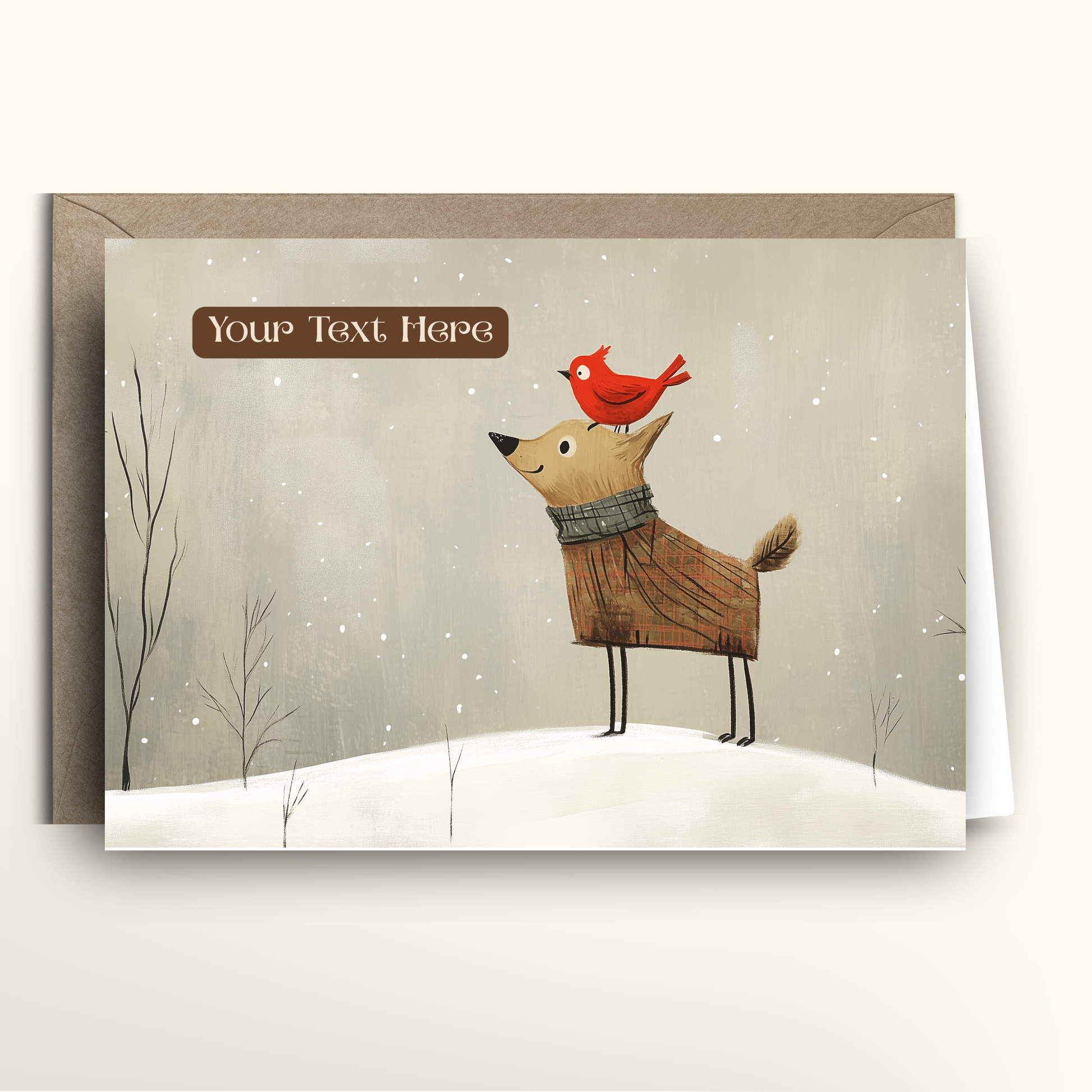 This delightful greeting card captures the warmth of winter friendship, featuring a cheerful dog in a cozy sweater with a bright red bird perched happily on its head. Set against a softly falling snow scene, it blends rustic charm with playful elegance. A perfect choice for sending joy and seasonal cheer.