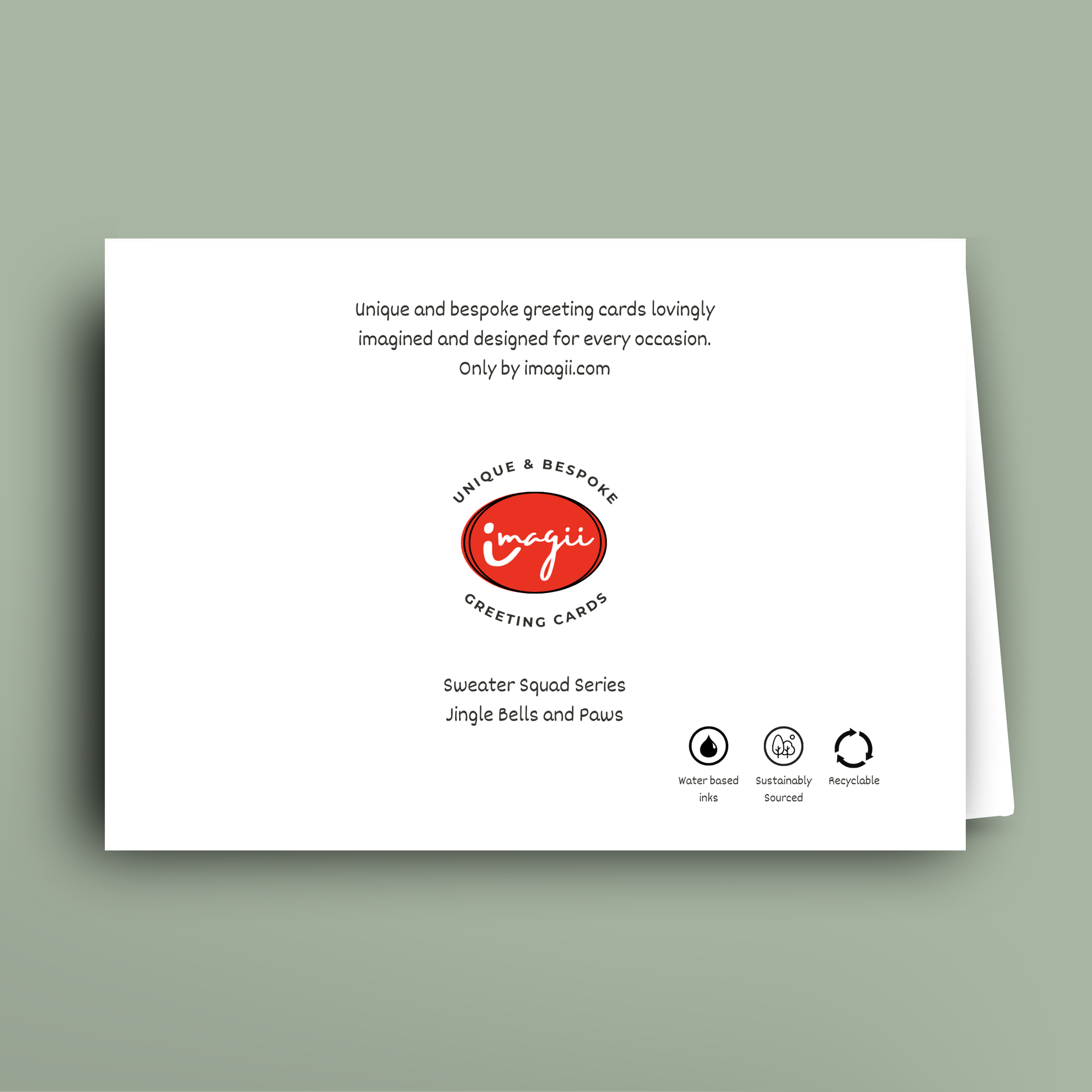 Standard card has "Jingle Bells and Paws" on the front. An alternative version is avaialble with "Merry Christmas" but you may also personalise your card on the front instead. Refer to the Personalisation description on how to make your card personal to you.