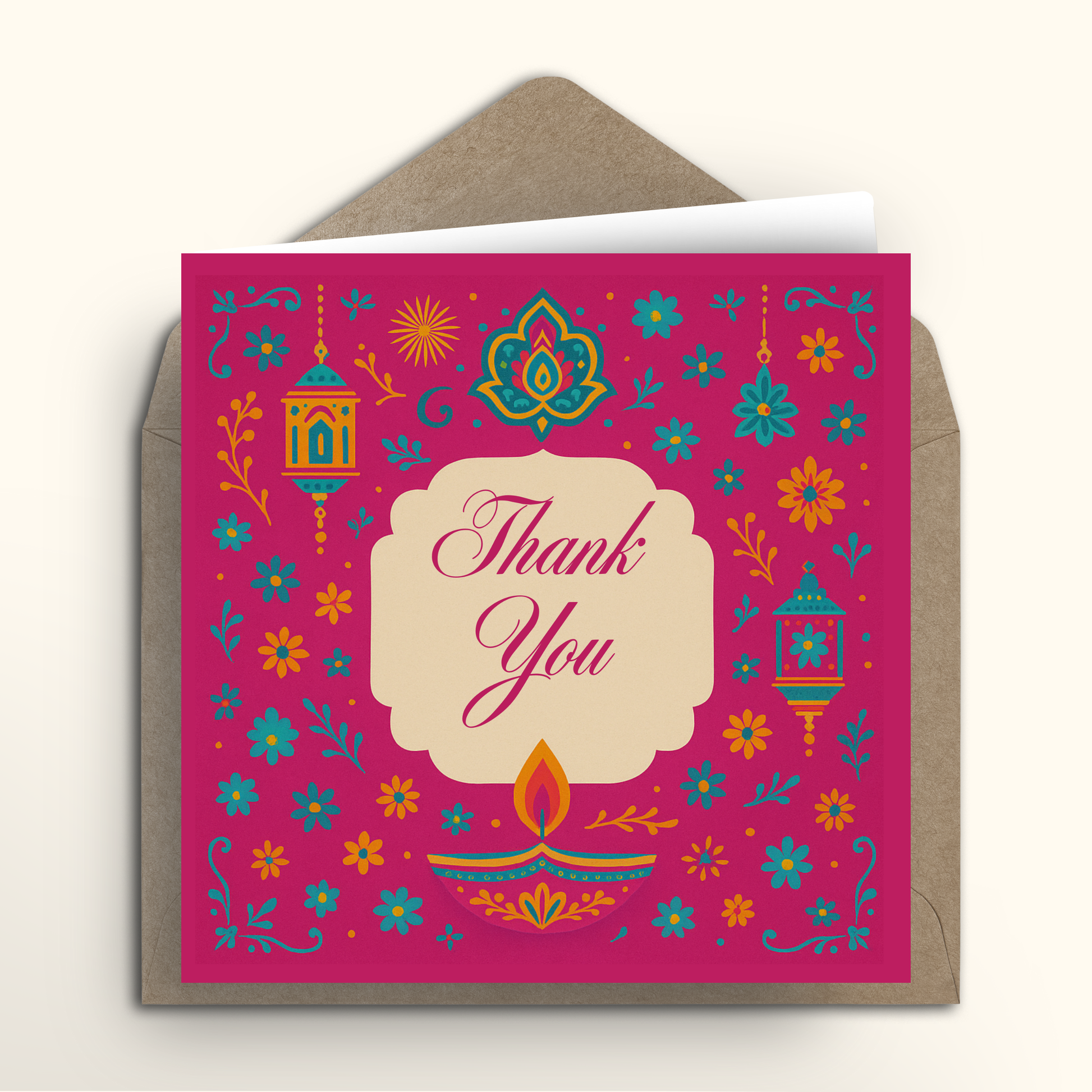 This beautifully designed greeting card radiates warmth and celebration, featuring a deep magenta backdrop adorned with floral and lantern motifs. At its heart, an elegant Thank You message is framed by intricate Indian-inspired patterns and a glowing diya, symbolizing light, gratitude, and connection. Perfect for expressing appreciation during festive seasons or any special moment.