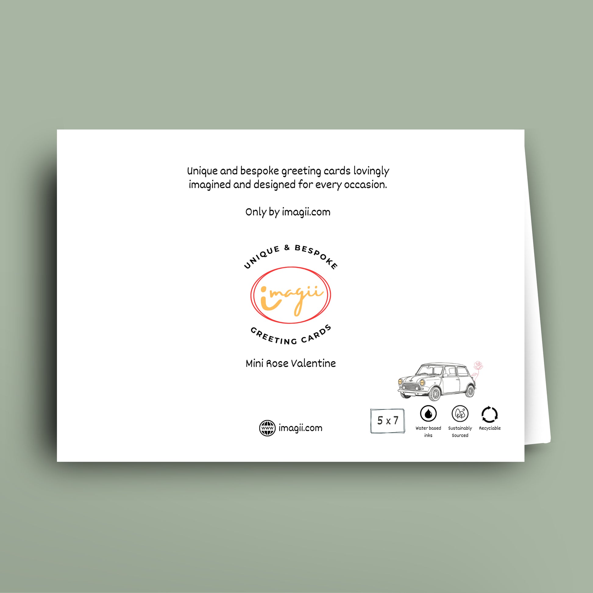 A cheeky, feel-good Valentine’s Day greeting card for mini car lovers, featuring a hand-drawn classic mini-style car with a doodle character holding a bright red rose. Choose from three funny romantic front messages (including the “wheely/cheesy” pun), perfect for couples who love a little humour with their romance. Printed on premium 300gsm matte cardstock, blank inside for your own message, and paired with a Kraft envelope—ready to gift across the UK, USA, Canada, and Australia with local printing/shipping (no international postage needed).
