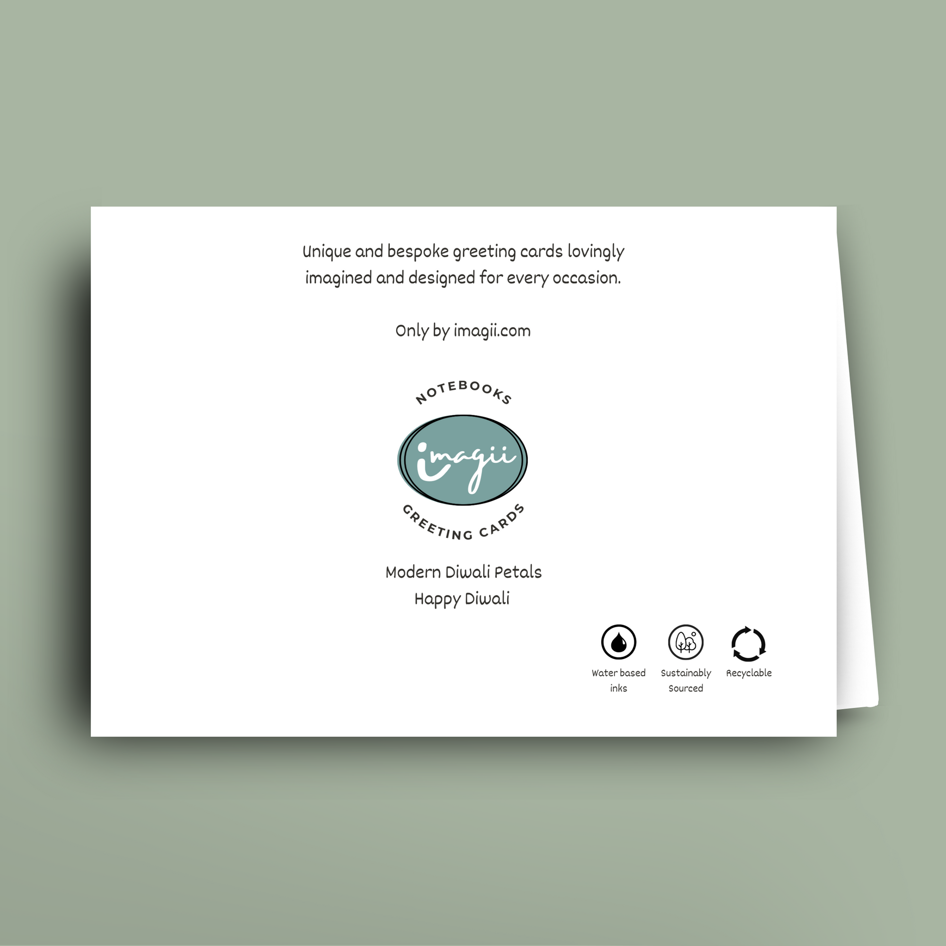 This modern Diwali greeting card features a striking design of layered, translucent petals in vibrant hues of teal, gold, coral, and pink. Soft glowing lights weave through the design, adding warmth and festivity. A contemporary take on tradition, it’s a radiant way to send joyful wishes for the Festival of Lights.
