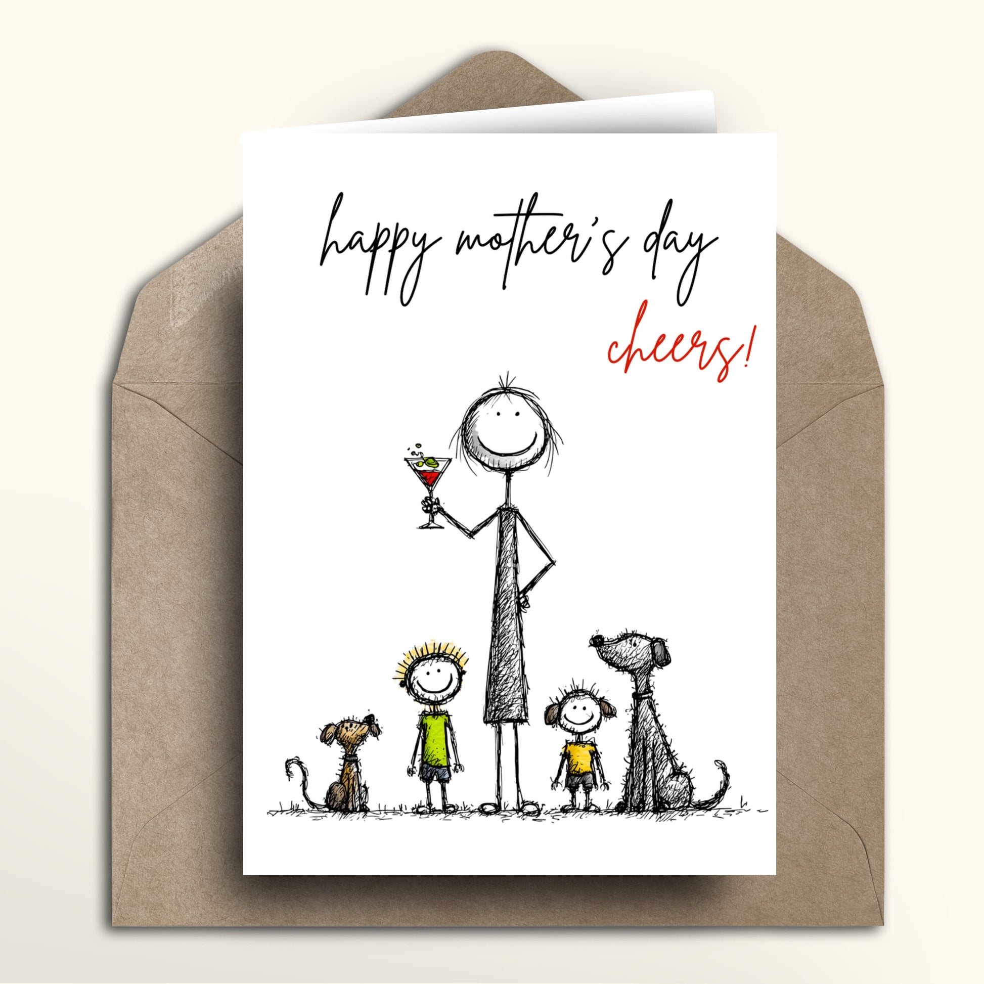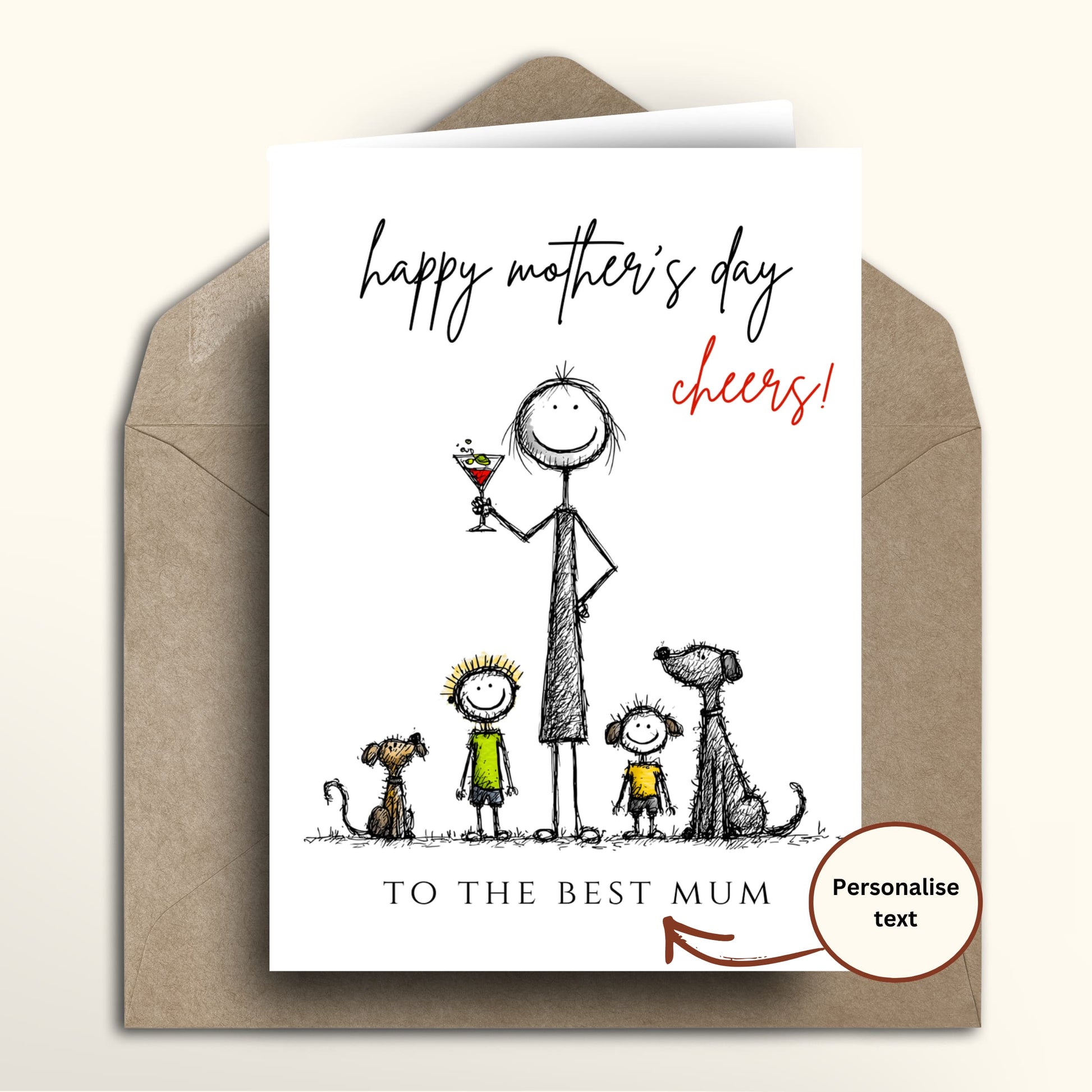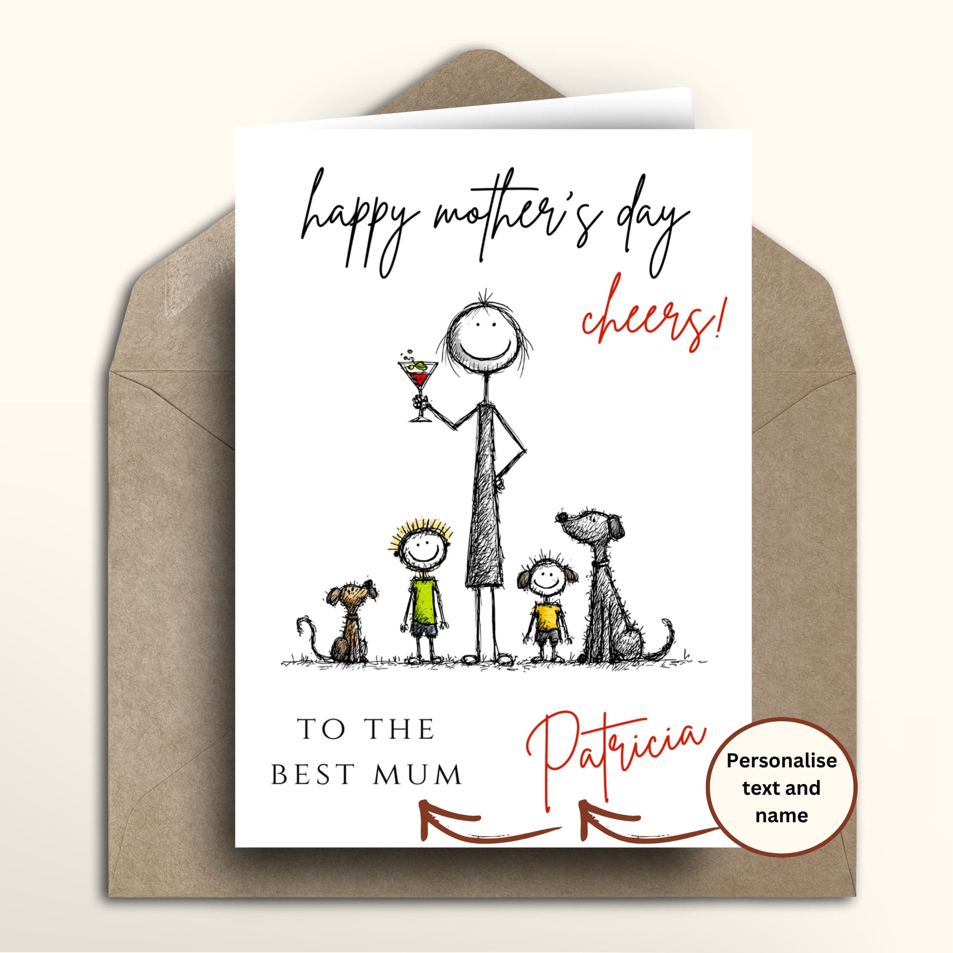 A funny Mother’s Day card with a sweet scribbly family scene — Mum raising a celebratory cocktail, two little ones, and the dogs — finished with “happy mother’s day, cheers!” on a clean white background. Choose the standard Mothering Sunday design, or personalise the bottom text and Mum’s name to make it extra special (e.g., “To the Best Mum” + “Patricia”). Printed on premium 300gsm matte cardstock, blank inside for your own message, and paired with a kraft envelope — printed and shipped locally in the UK, USA, Canada, and Australia with no international postage required.