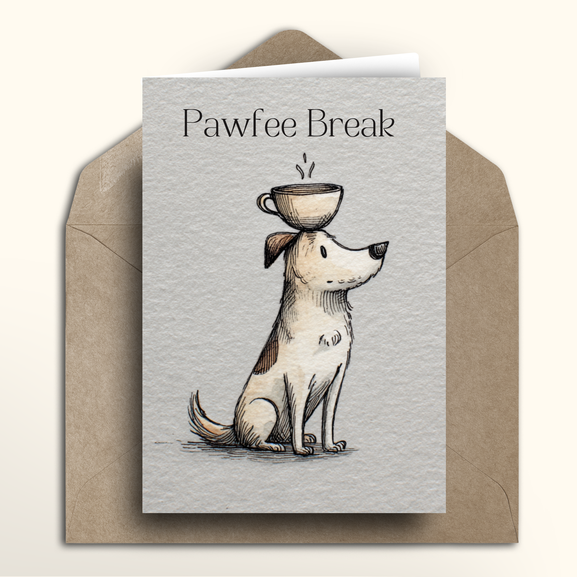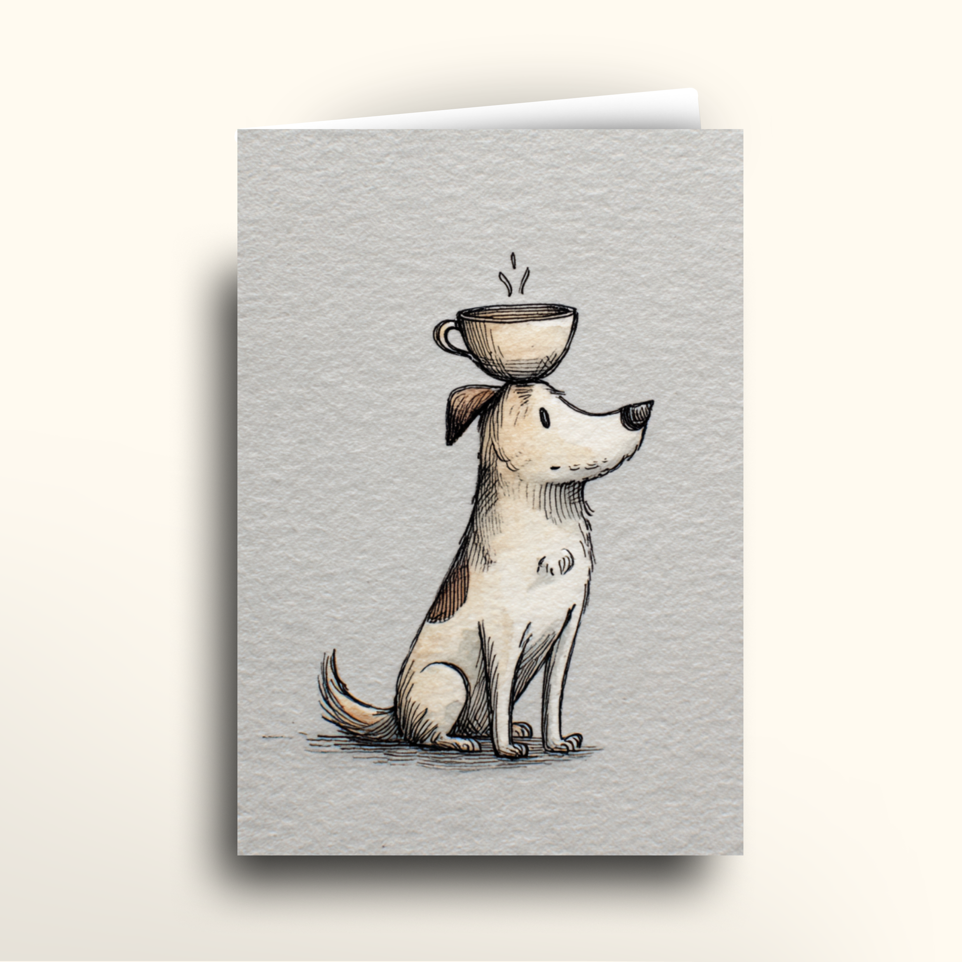 Warm and whimsical, this charming card features a thoughtful pup balancing a steaming cup of hot drink — perfect for birthdays, thank-yous, or just because. Lovingly designed with hand-drawn detail, it’s a delightful way to send comfort, smiles, and a touch of calm.