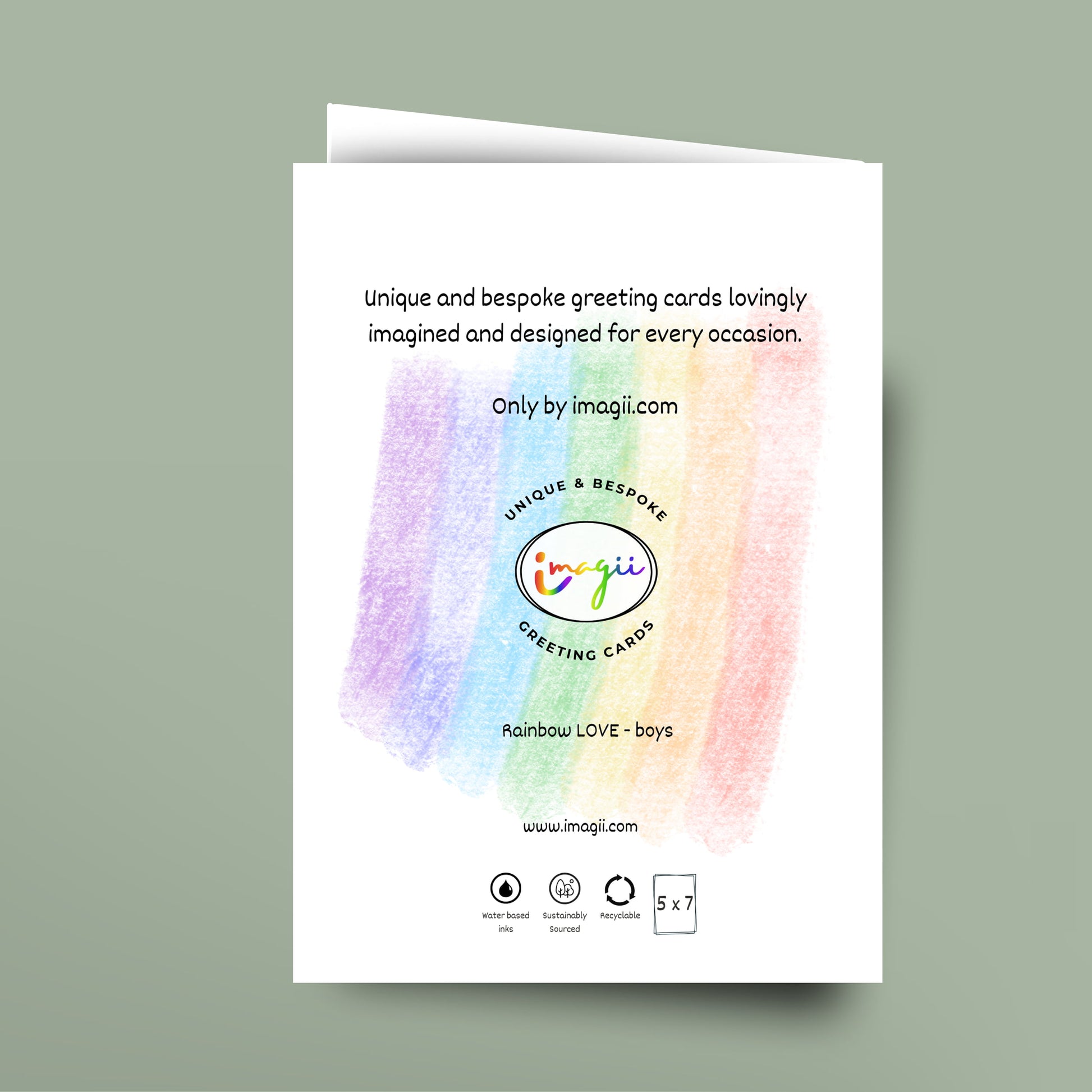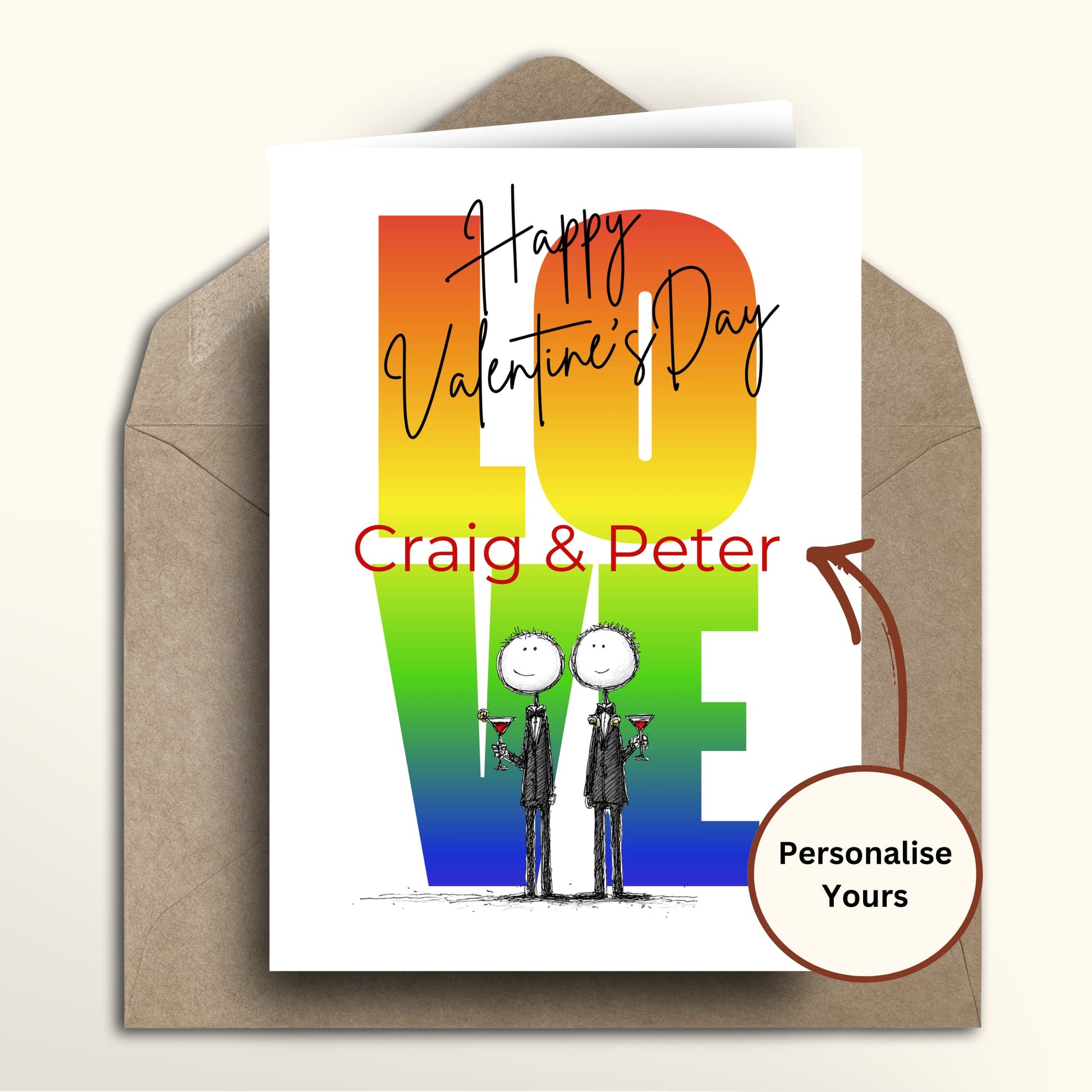 Celebrate Happy Valentine’s Day with this bold and colourful card created especially for gay couples. The front features a large rainbow “LOVE” with two hand-drawn men in suits, each holding a cocktail – a fun, stylish nod to LGBTQ+ love. Choose the standard version with just “Happy Valentine’s Day” or personalise with your own name(s) on the front for an extra-special keepsake. A perfect card for men who want something modern, proud and romantic.