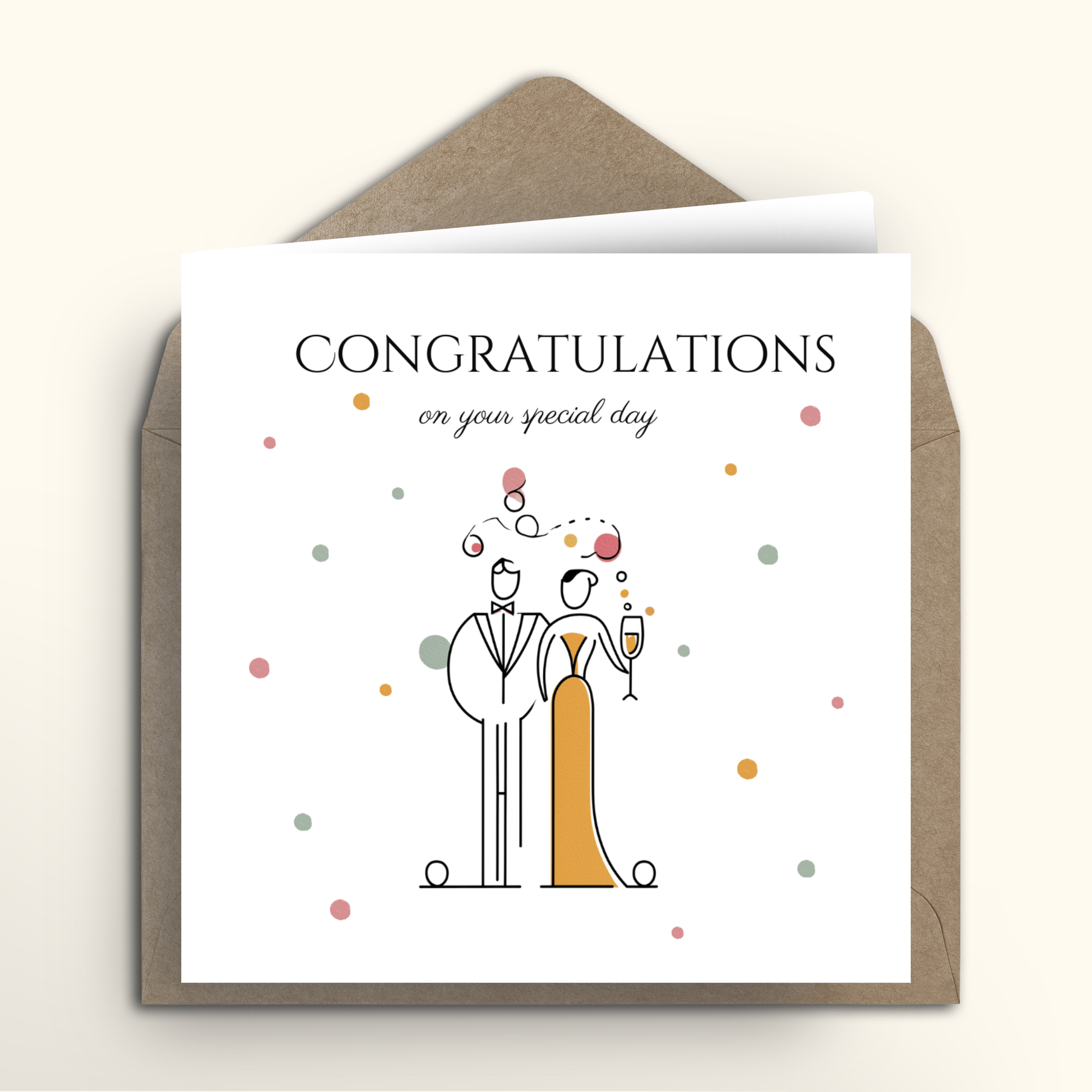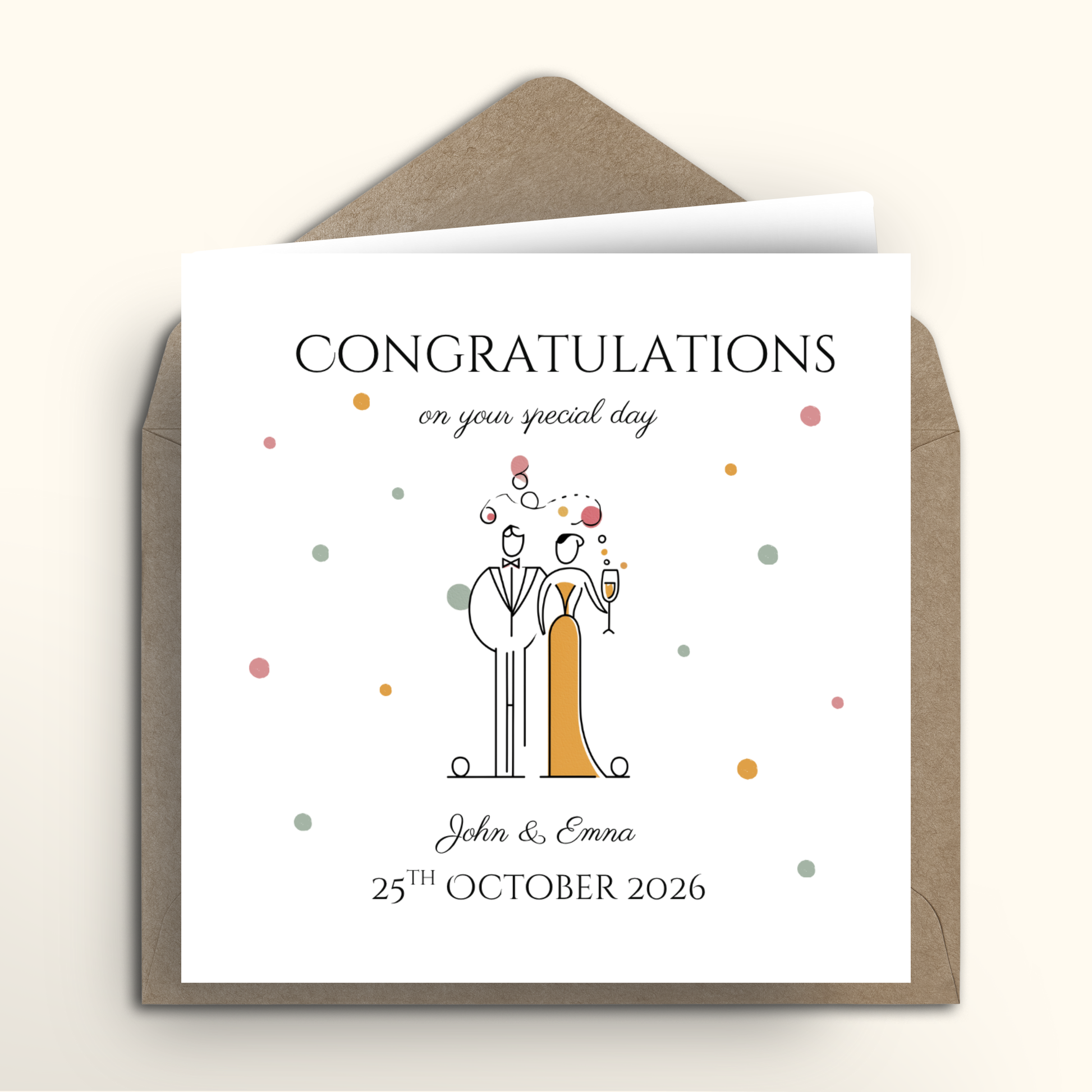 Personalised wedding, anniversary, engagement, civil partnership card with a champagne glass for those two special people. Personalise your card with your text and names.